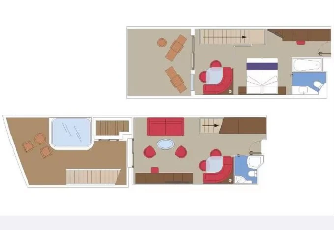 | YJD - Yacht Club Duplex Suite s vírivkou 46 m² + balkón 30 m². Vírivka. 2 podlažia, šatník, 2 kúpeľne (1 s vaňou). Max 4 osoby. 16. paluba. Cenový model MSC Yacht Club. | 9 612 € 3 204 € za osobu |